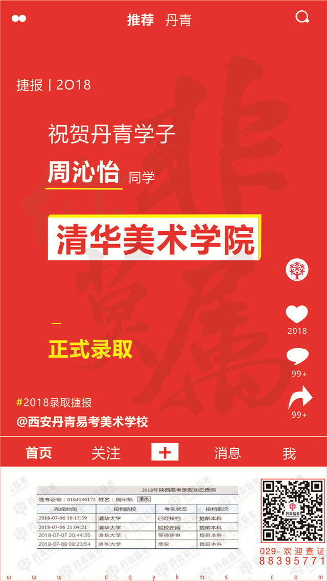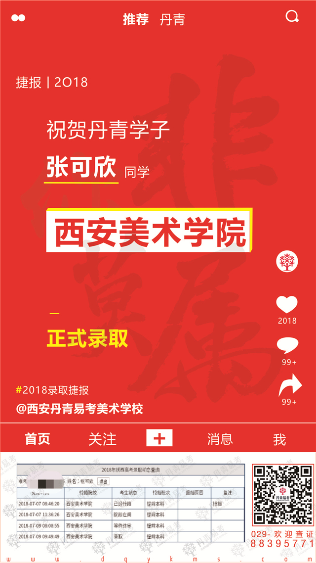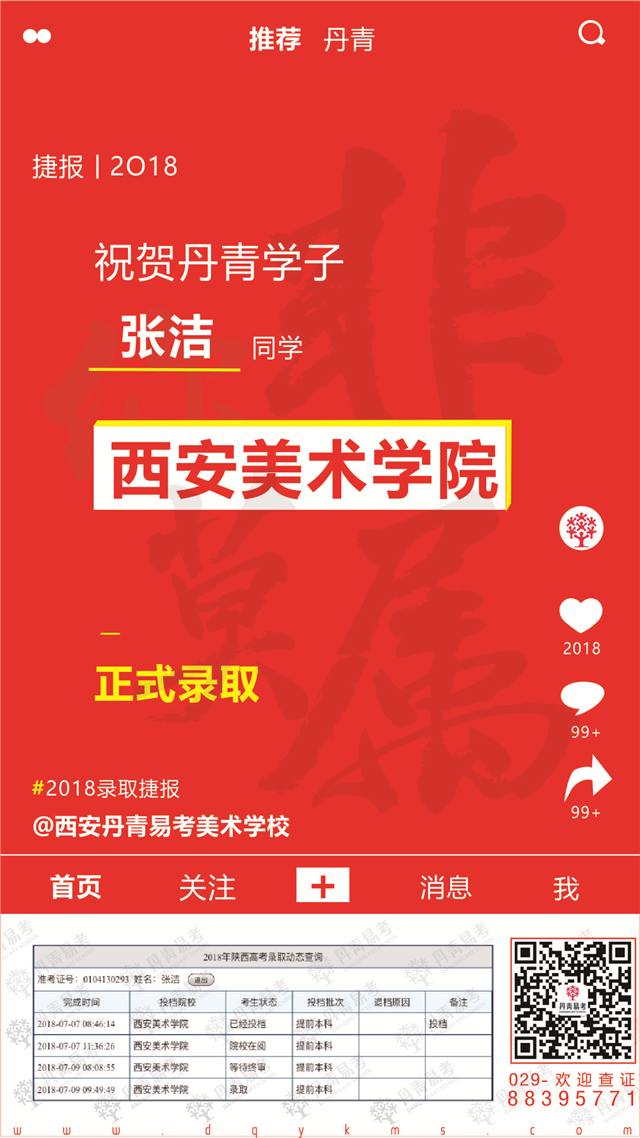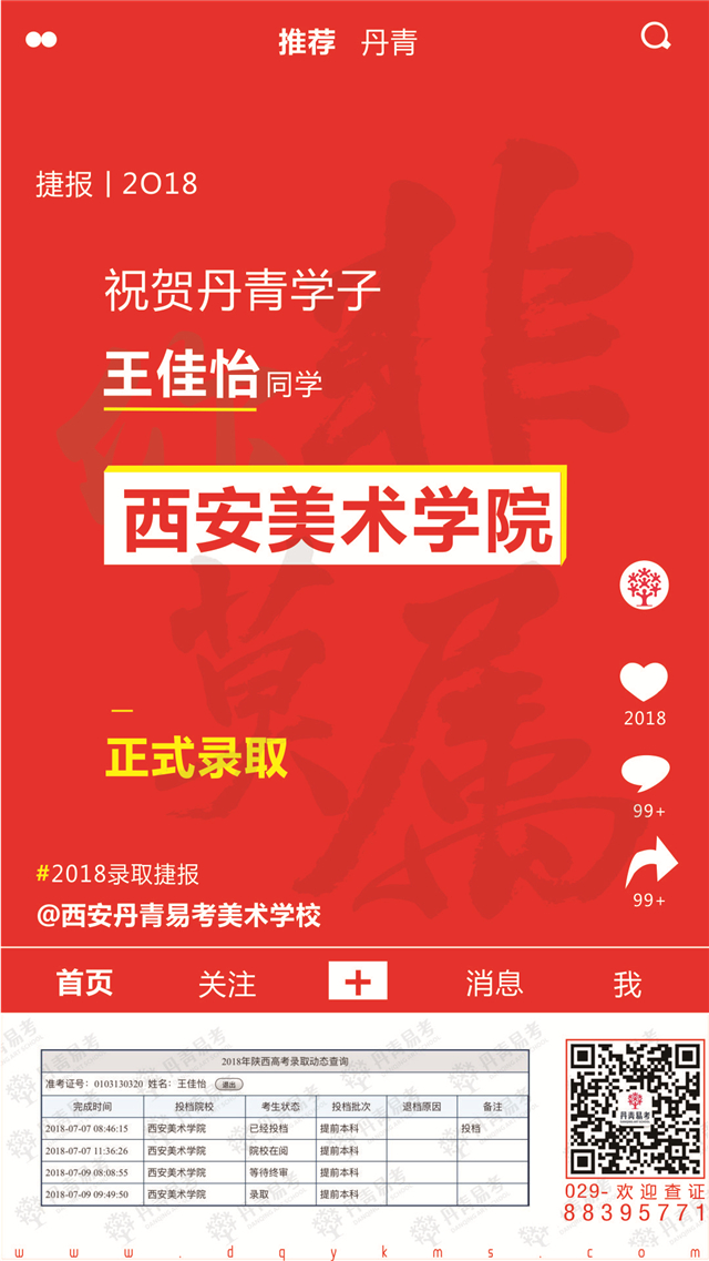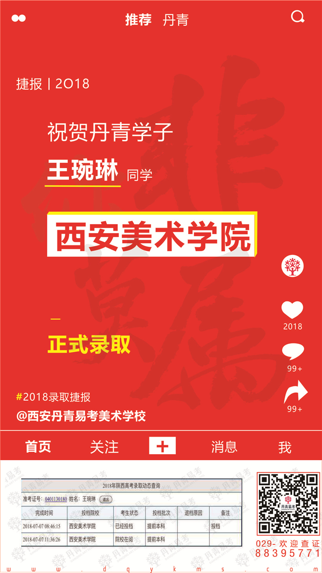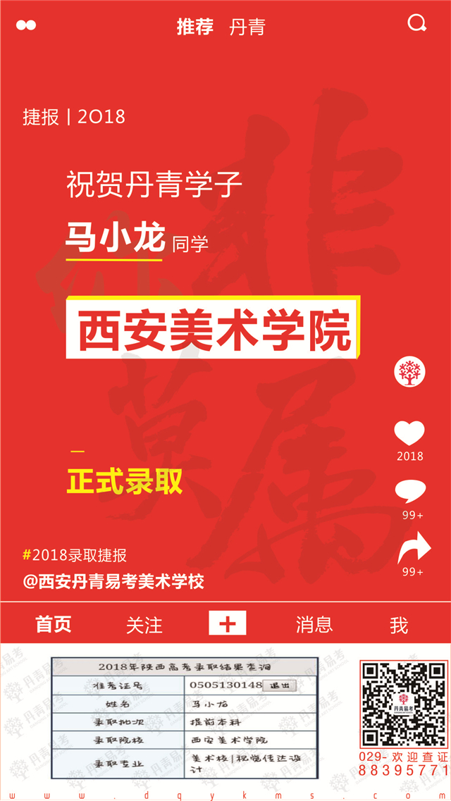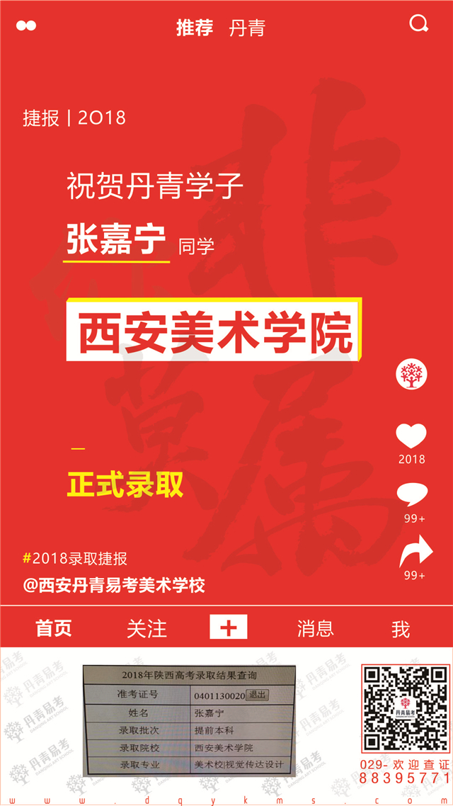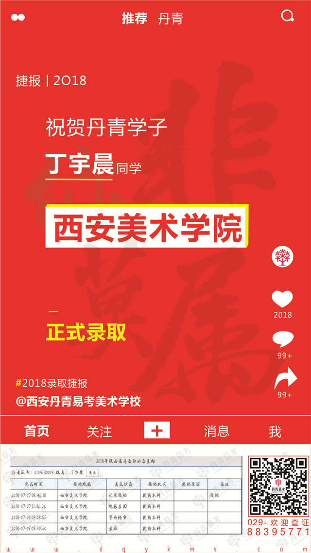 现在的美术培训行业较为混乱,出现有些画室ps学生成绩、录取截图的现象,扰乱美术培训市场,混淆考生及家长的判断。丹青易考作为西北美术教育的品牌机构作出表率,以下所公示录取榜单均真实,有效,若您对我们公示的榜单有异议,欢迎查证!