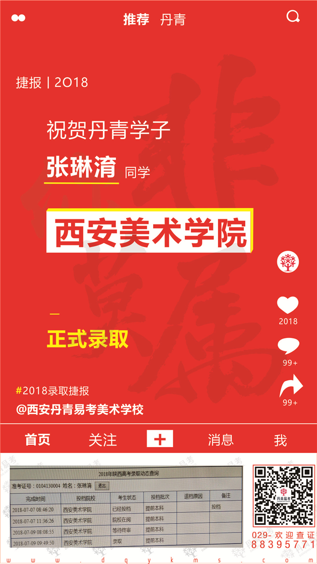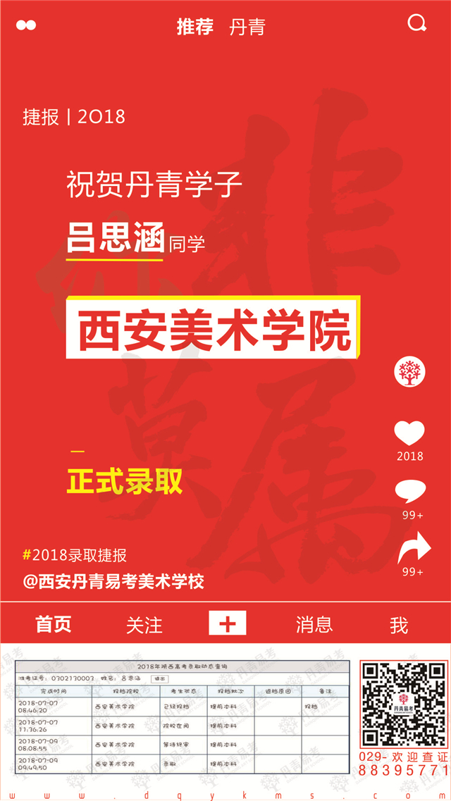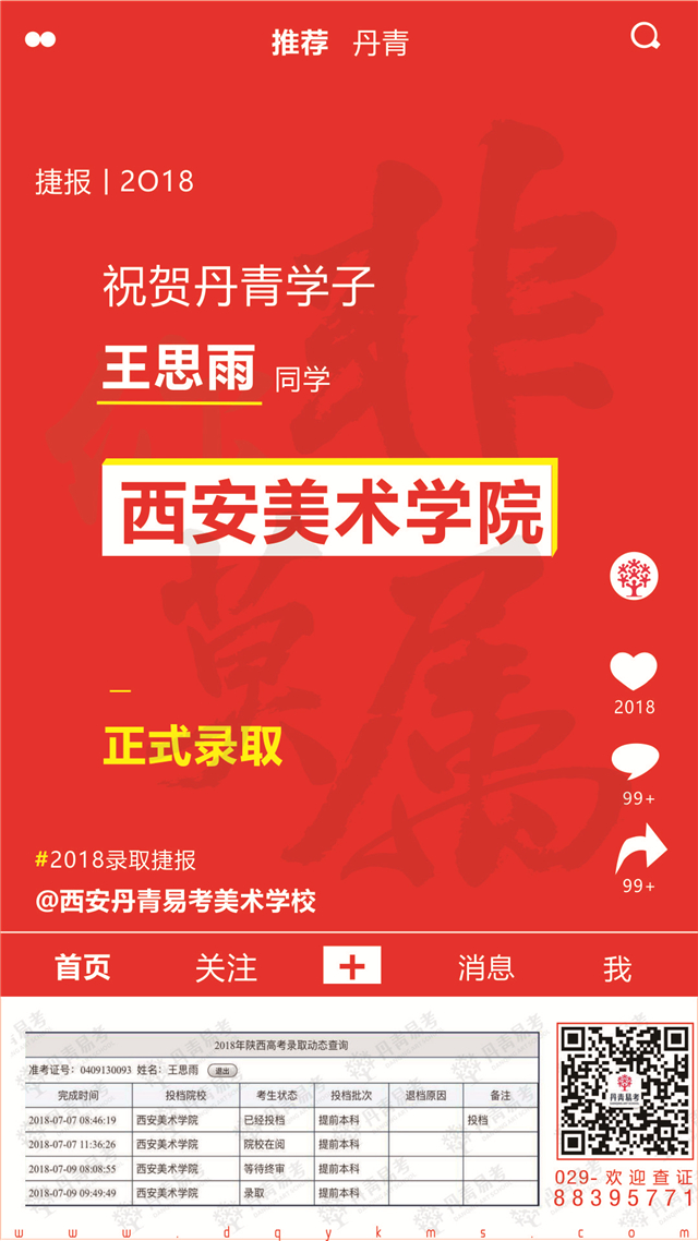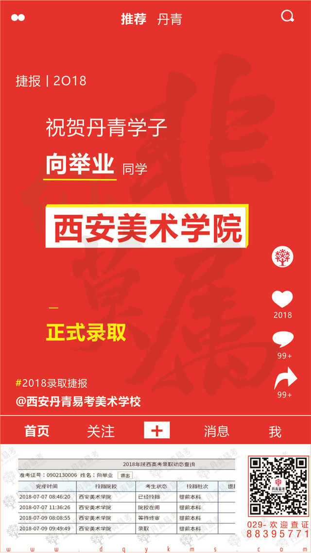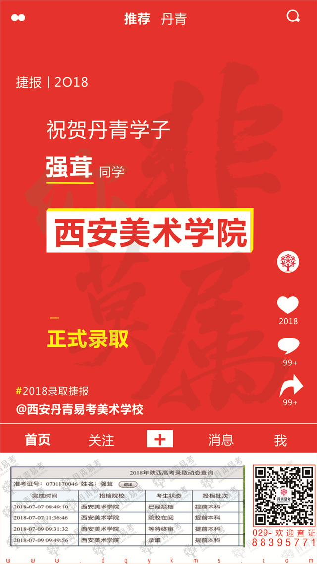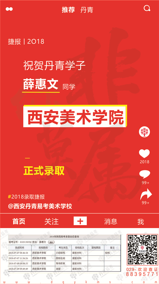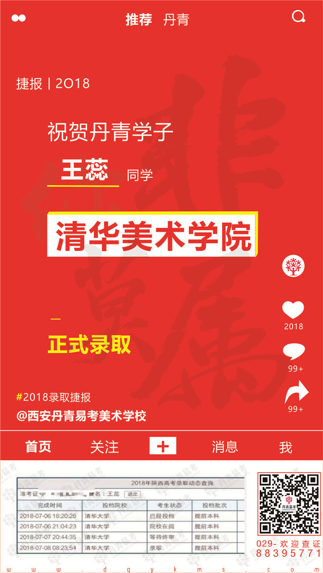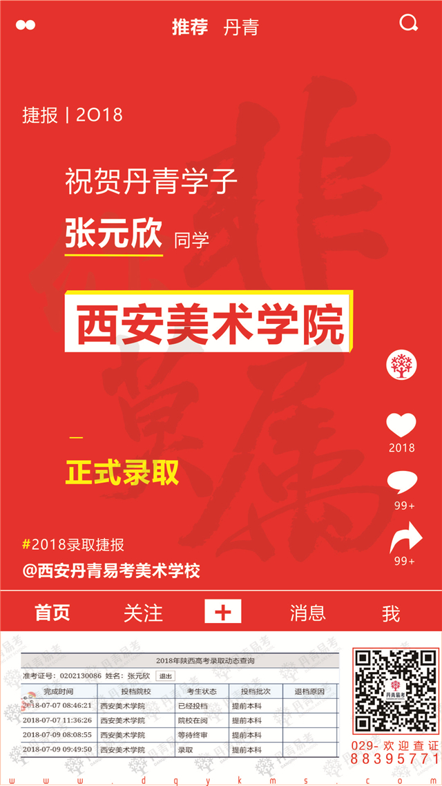 现在的美术培训行业较为混乱,出现有些画室ps学生成绩、录取截图的现象,扰乱美术培训市场,混淆考生及家长的判断。丹青易考作为西北美术教育的品牌机构作出表率,以下所公示录取榜单均真实,有效,若您对我们公示的榜单有异议,欢迎查证!