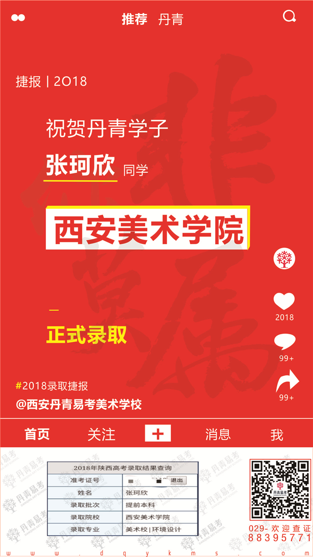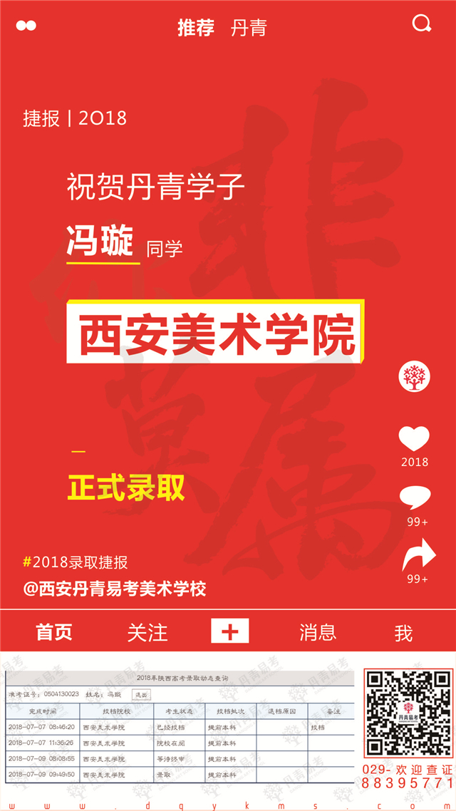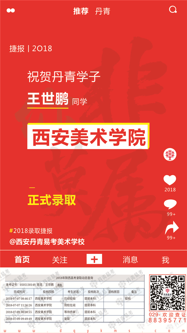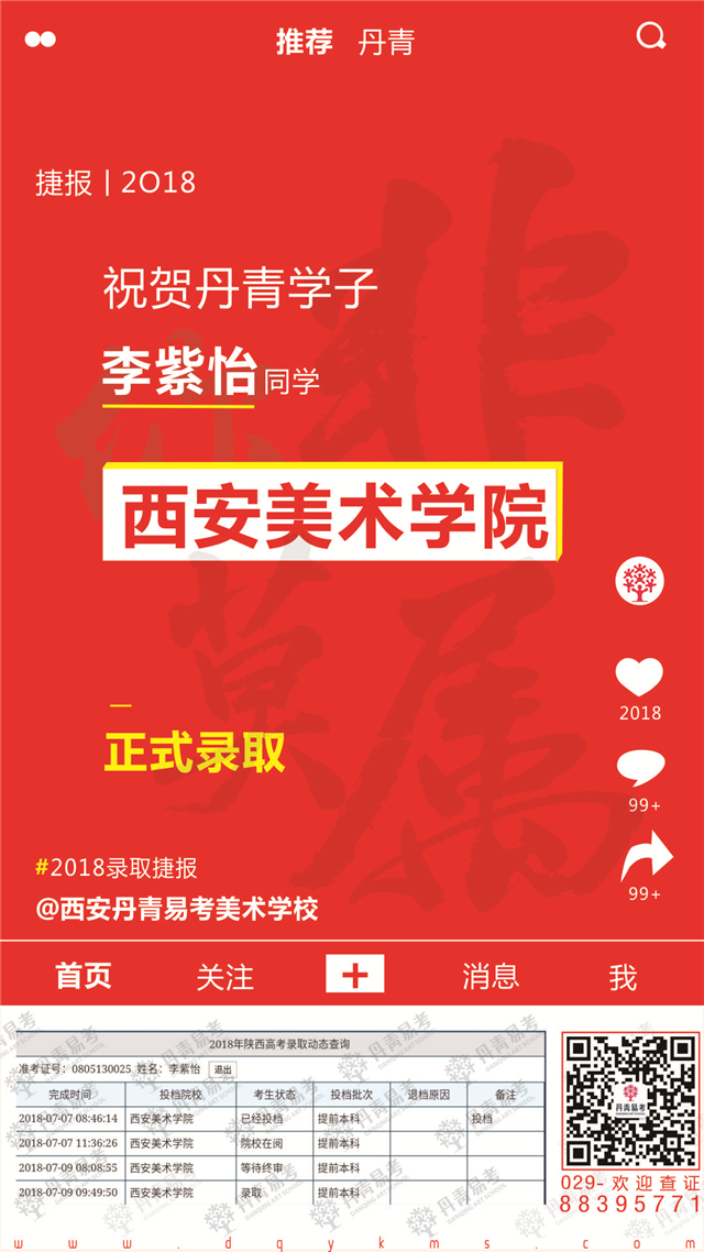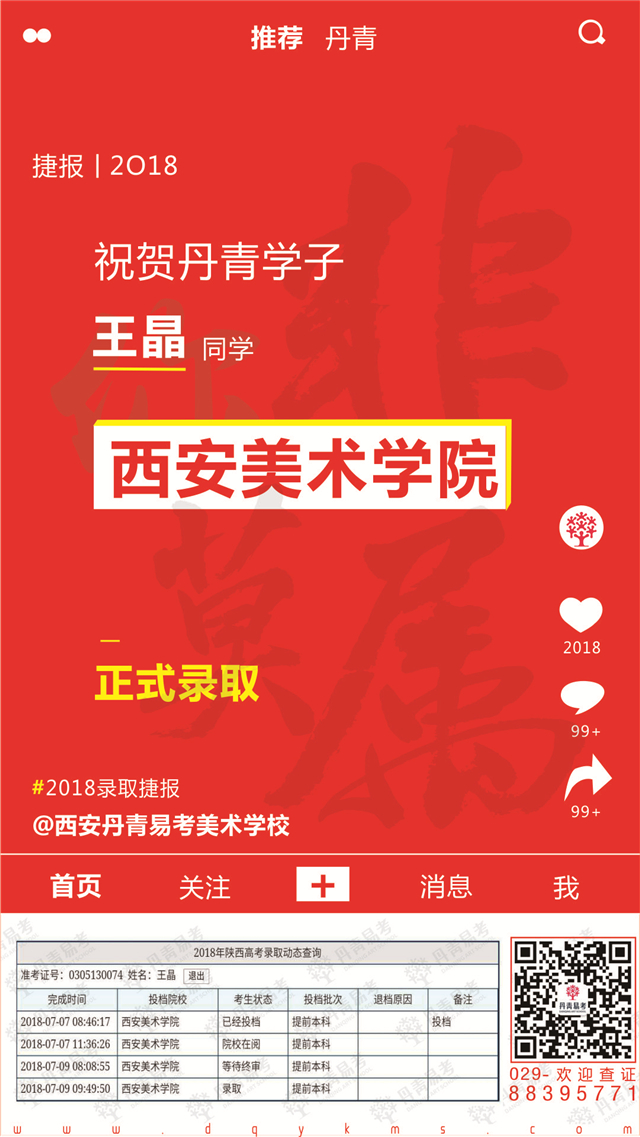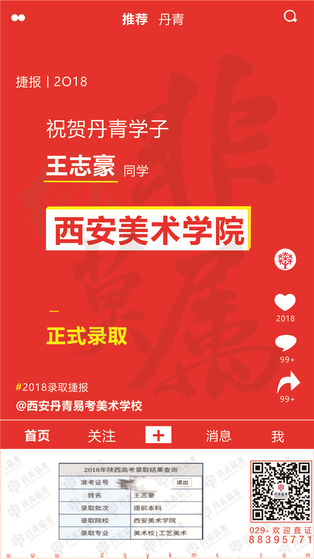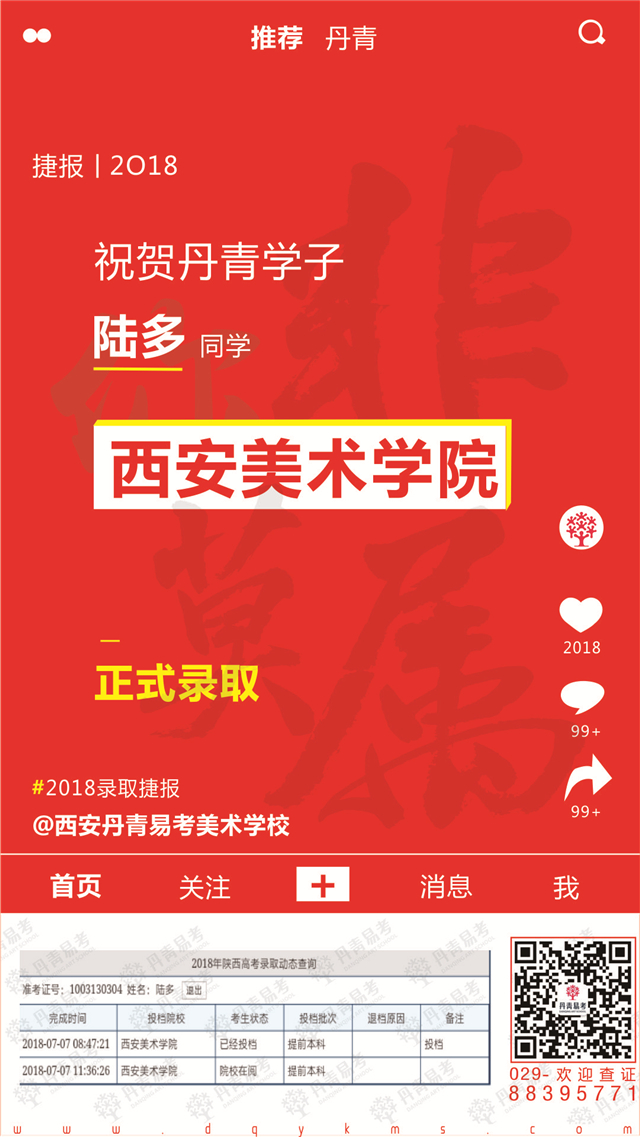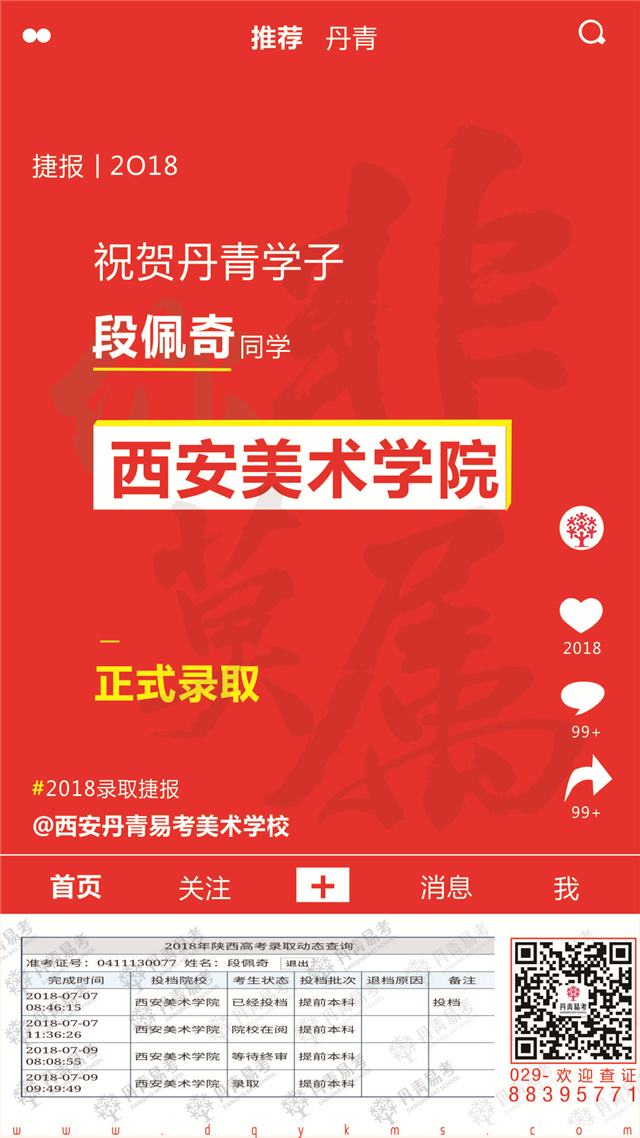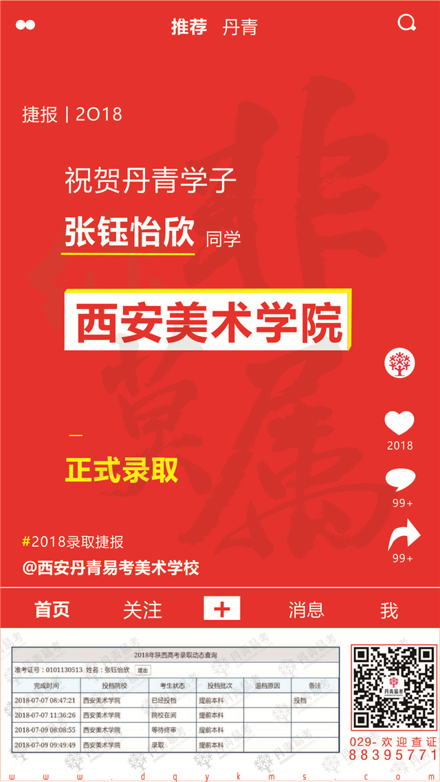 现在的美术培训行业较为混乱,出现有些画室ps学生成绩、录取截图的现象,扰乱美术培训市场,混淆考生及家长的判断。丹青易考作为西北美术教育的品牌机构作出表率,以下所公示录取榜单均真实,有效,若您对我们公示的榜单有异议,欢迎查证!
