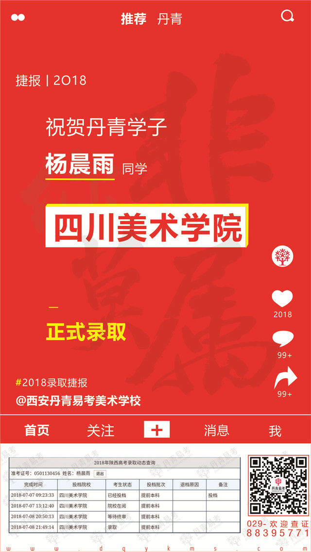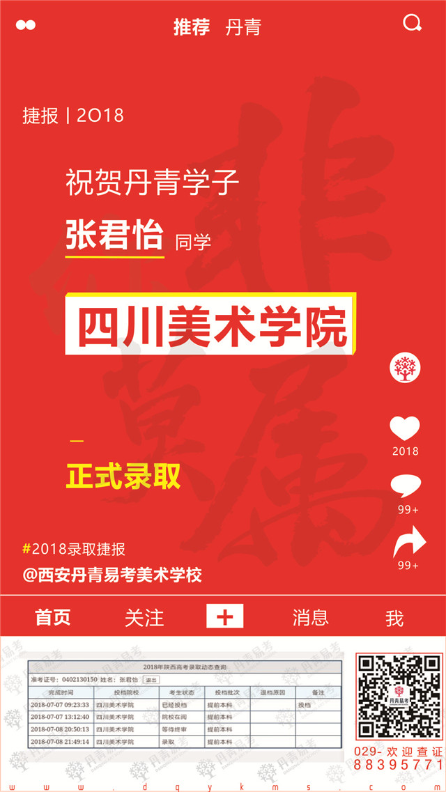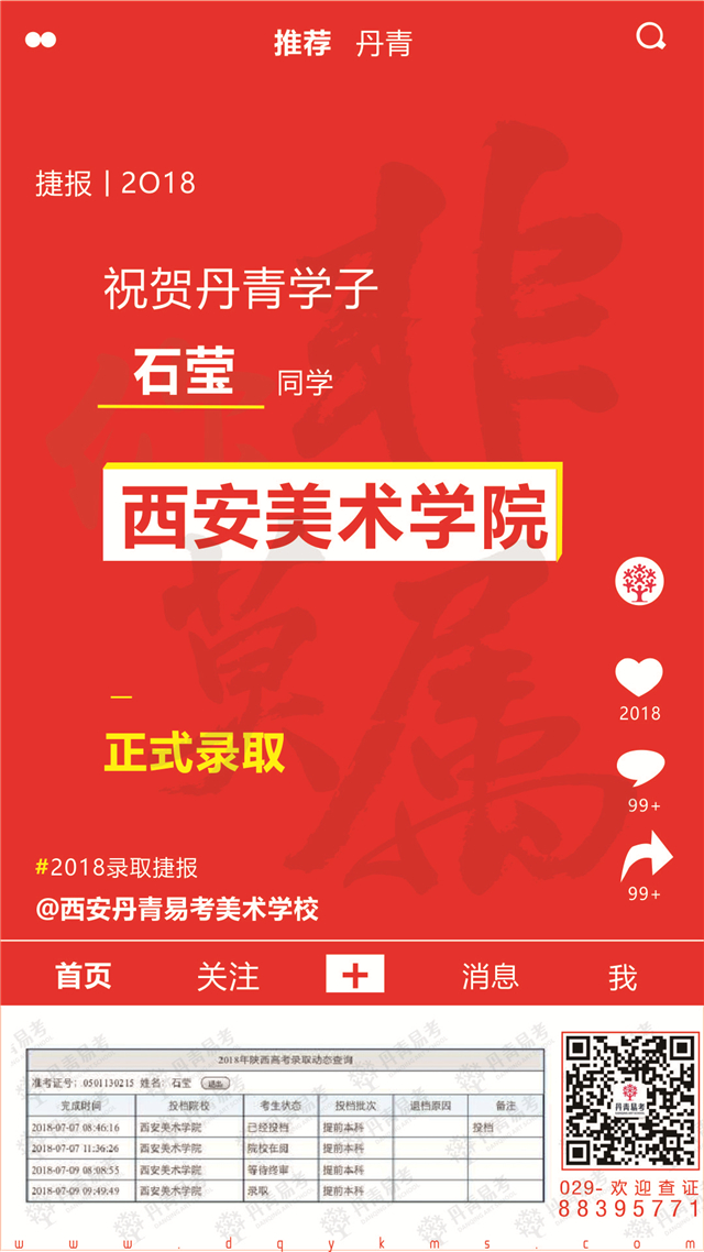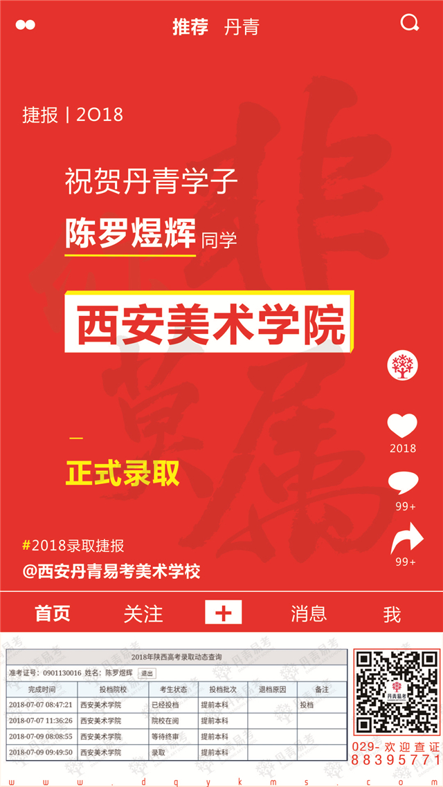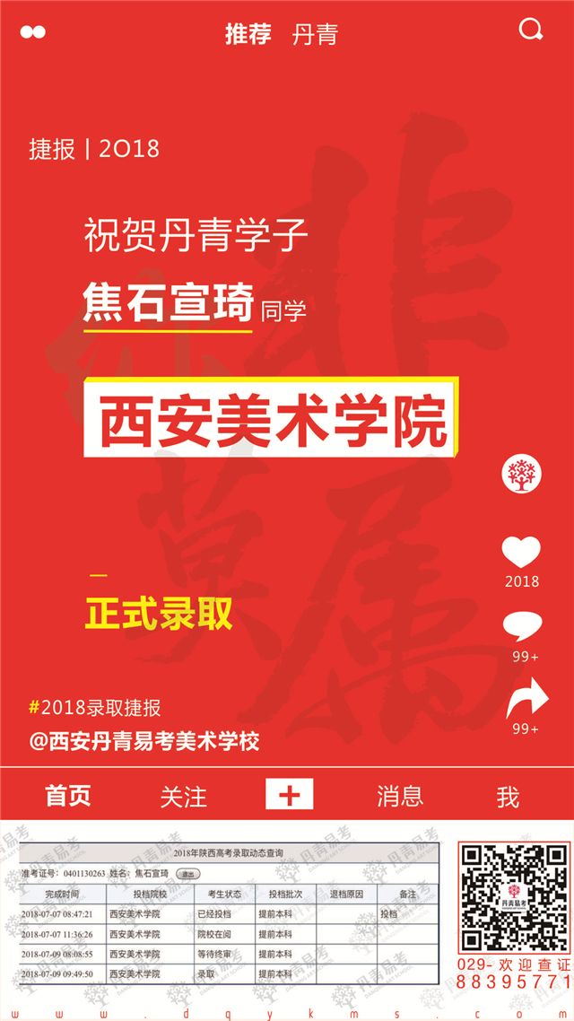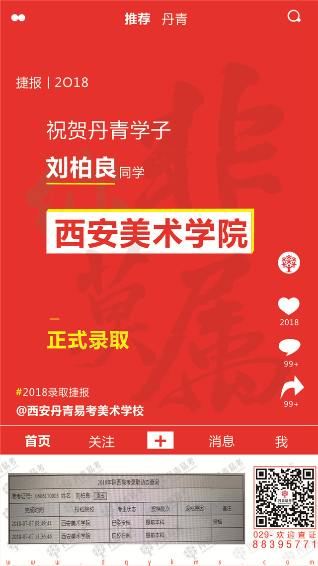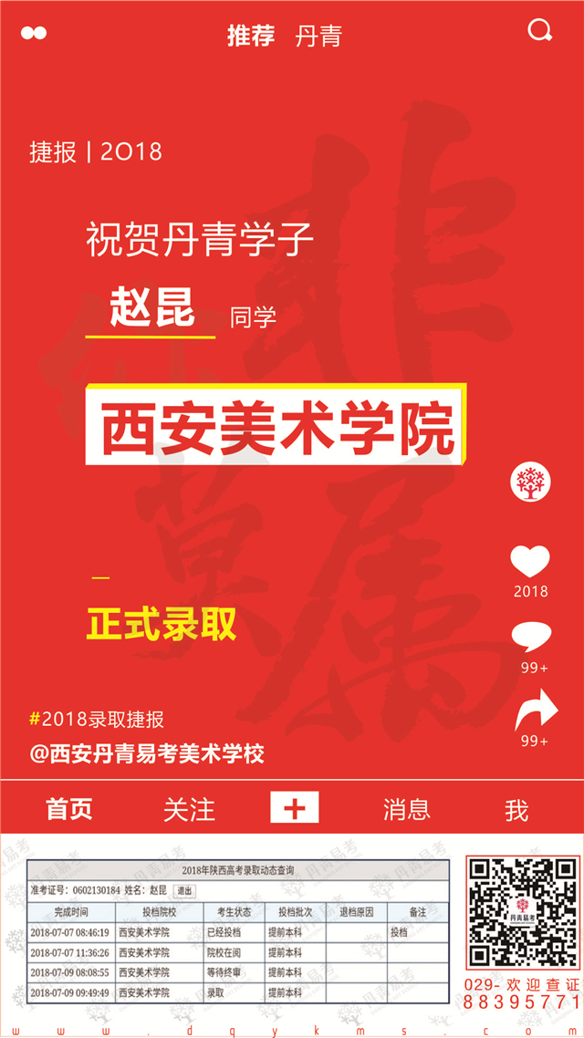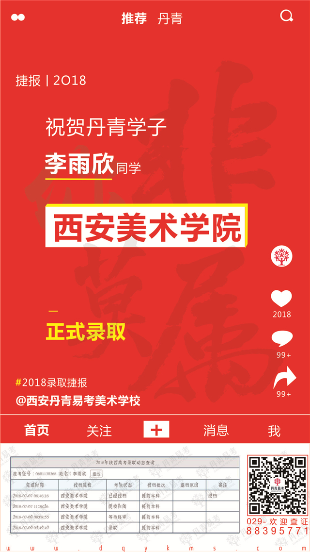 现在的美术培训行业较为混乱,出现有些画室ps学生成绩、录取截图的现象,扰乱美术培训市场,混淆考生及家长的判断。丹青易考作为西北美术教育的品牌机构作出表率,以下所公示录取榜单均真实,有效,若您对我们公示的榜单有异议,欢迎查证!