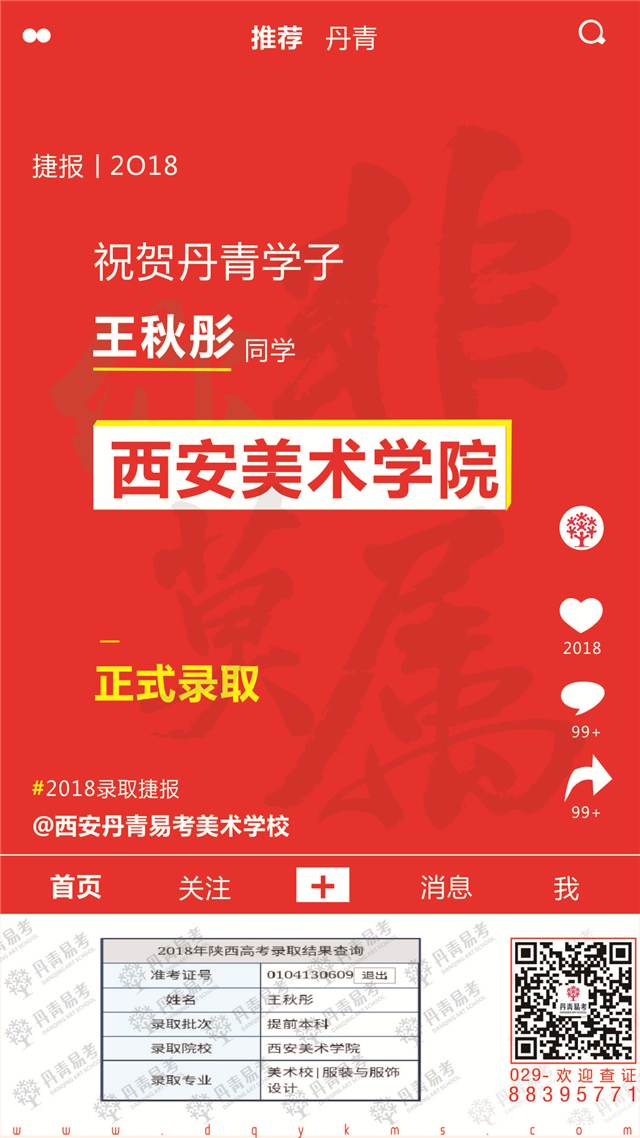 ② 可致电丹青易考招生办,丹青招生办将核实来电身份后,以短信的形式把考生信息发送至您的手机,以便您查证!(电话:029-88395771/029-89381035)
