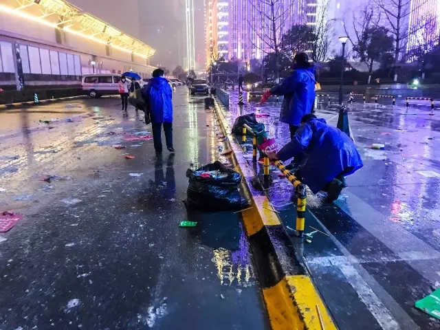 而这些最终以垃圾成山的场面留给了清洁工人!直到考试结束,所有的人离场,只有四位清洁工和丹青易考后勤工作人员为这场考试后的“垃圾灾难”做最后的清场!足足清理了100多袋垃圾,每袋有20多斤重,由于下雨垃圾大部分为纸质类宣传页的原因,粘在地上清理难度比平时大很多。为他们在人前人后默默付出的一切劳动与辛苦点赞!相信任何情况下做到有始有终的人都能得到最好的敬佩!