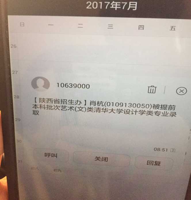艺考结束,开始了文化课冲刺,每天都是爸爸接送,肖杭记得清华大学公布成绩那天,自己正在上课,偷偷的钻到桌子底下给我爸爸打电话让帮我查成绩,电话里他操着陕普话说:“过咧,过咧”。