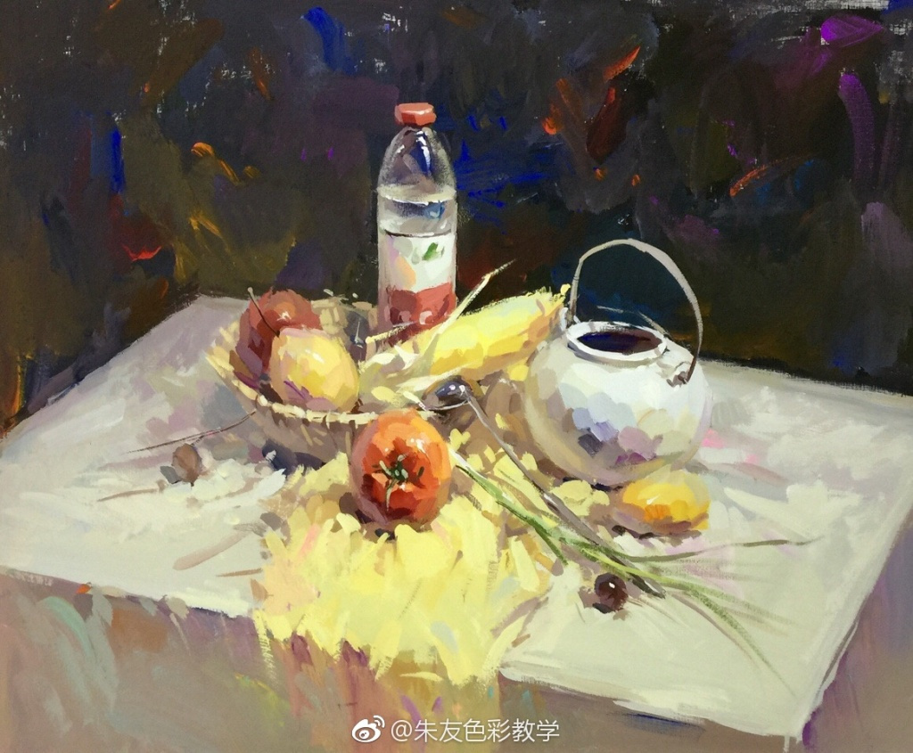 总之,比较地看,就是比较对象中各个物体的色彩相互关系(冷暖、色相、纯度和明度)。作画过程从某个色度看,也可简单地概括为:找“关系”、比“关系”和画“关系”。